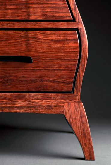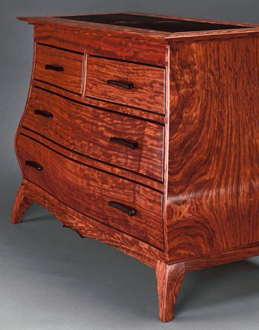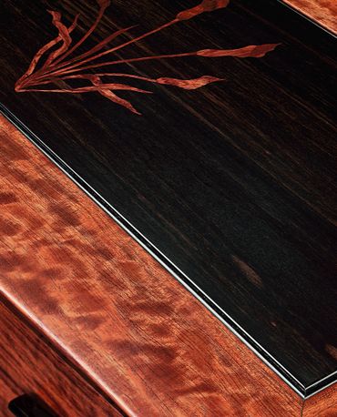 The cabinet and drawer fronts were shaped from stock that was over 3” thick. All the shaping was done with hand tools. The front not only bulges at the bottom (similar to the sides), but also has a serpentine shape running from side to side. All cabinet framework and drawers are hand dovetailed and the drawers are trimmed with ebony beading. There is an ebony panel in the top of the cabinet. I used intarsia technique to inlay a bubinga calalilly plant into the panel.