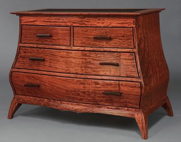 The Bombe’ chest is a traditional furniture form developed by the French. It can stand alone as this one does, or be used as a lower chest of drawers in pieces like the secretary and chest-on-chest.