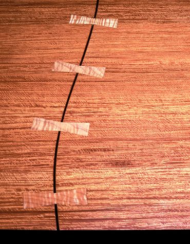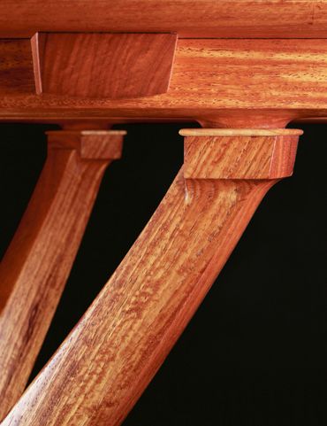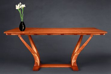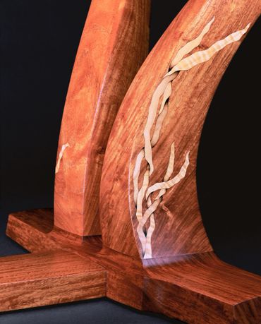 The top of this Desk is made up of three narra panels joined with maple butterfly keys. One of the keys is interchangeable with a split version that allows discreet wiring from below for any computer components. It is a beautiful surface to work at, but this Desk is really all about the base. Most of the surfaces have been shaped to give them a soft, pillow effect. The legs were carved from blanks about 6” thick. As they rise from the bottom plates, they curve and twist. They support a system of rails and cross-rails that the top panels are mounted to. I used a technique that involves dipping parts in hot sand to create three dimensional shadow effects in the maple intarsia “foliage” set into the leg bottoms.