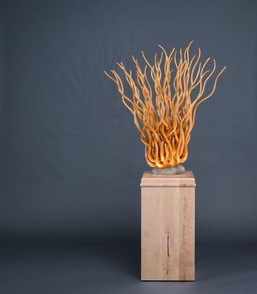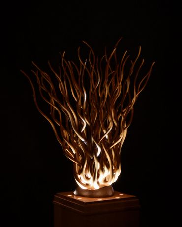 I placed dimmable LED lights in the pedestal top to up-light the sculpture. They are controlled by a remote and create beautiful effects. Placed in my home, I lit her with halogen spots to create a presentation similar to the portfolio photos. I have lots of windows and during the day, as the sun swings around, the light from outside takes over and "Glory" transitions through many beautiful personalities.