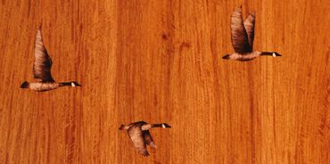 I designed this set for a home with a lakeside view. Standing in the open kitchen, you look through the dining area and out a wall of windows to the lake. I tried to bring that view to the table with intarsia designs of water iris, cattails and geese. These designs were also carried into several of the chair backs. I spent over 3 months on the intarsia work. This was the first time I have done intarsia with multiple wood species. I enjoyed the work and learned a lot. I actually felt more like a painter than a woodworker. As the days went by, it was fun to watch the pictures come together .
