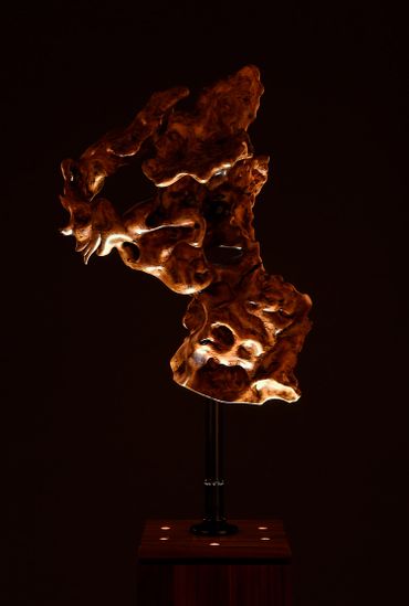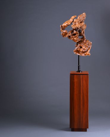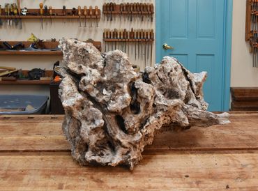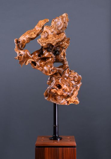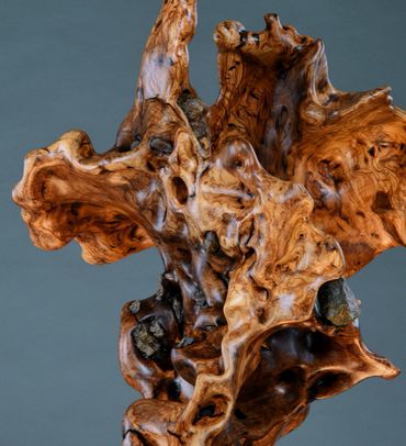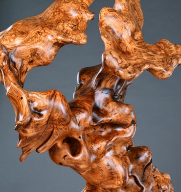 The burl was heavily weathered. In many areas I had to remove a lot of material to get down to good solid wood. I also removed a number of trunks the root system had sent up. The search for forms became a real collaboration. I had to work with what the burl gave me. Often, that changed dramatically as I removed material. Every day I carved was a new adventure. Those days of carving were some of the most focused, absorbed, Zenish days of my career.